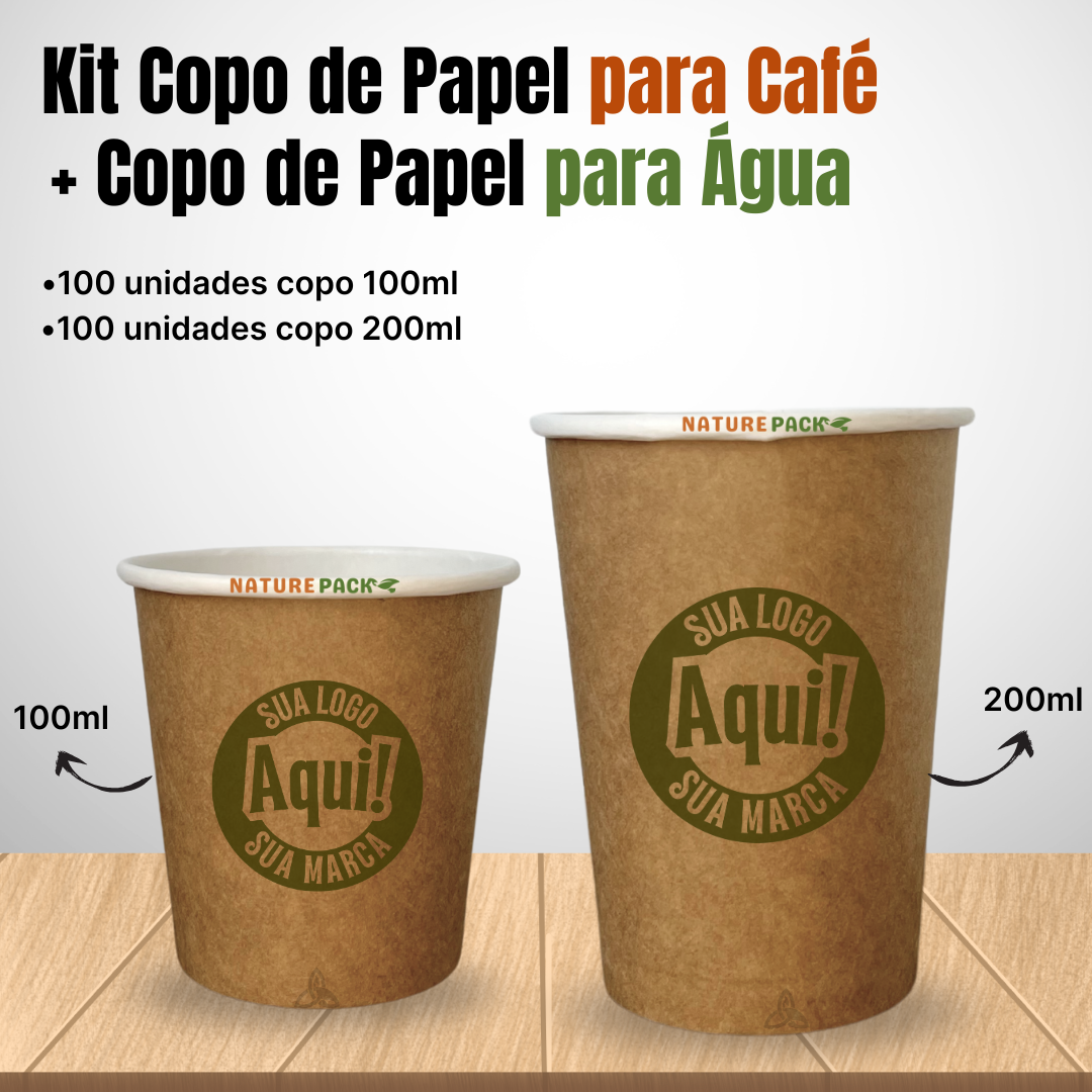 Kit completo com copo de papel para café quente e copo de papel para água, suco ou refrigerante