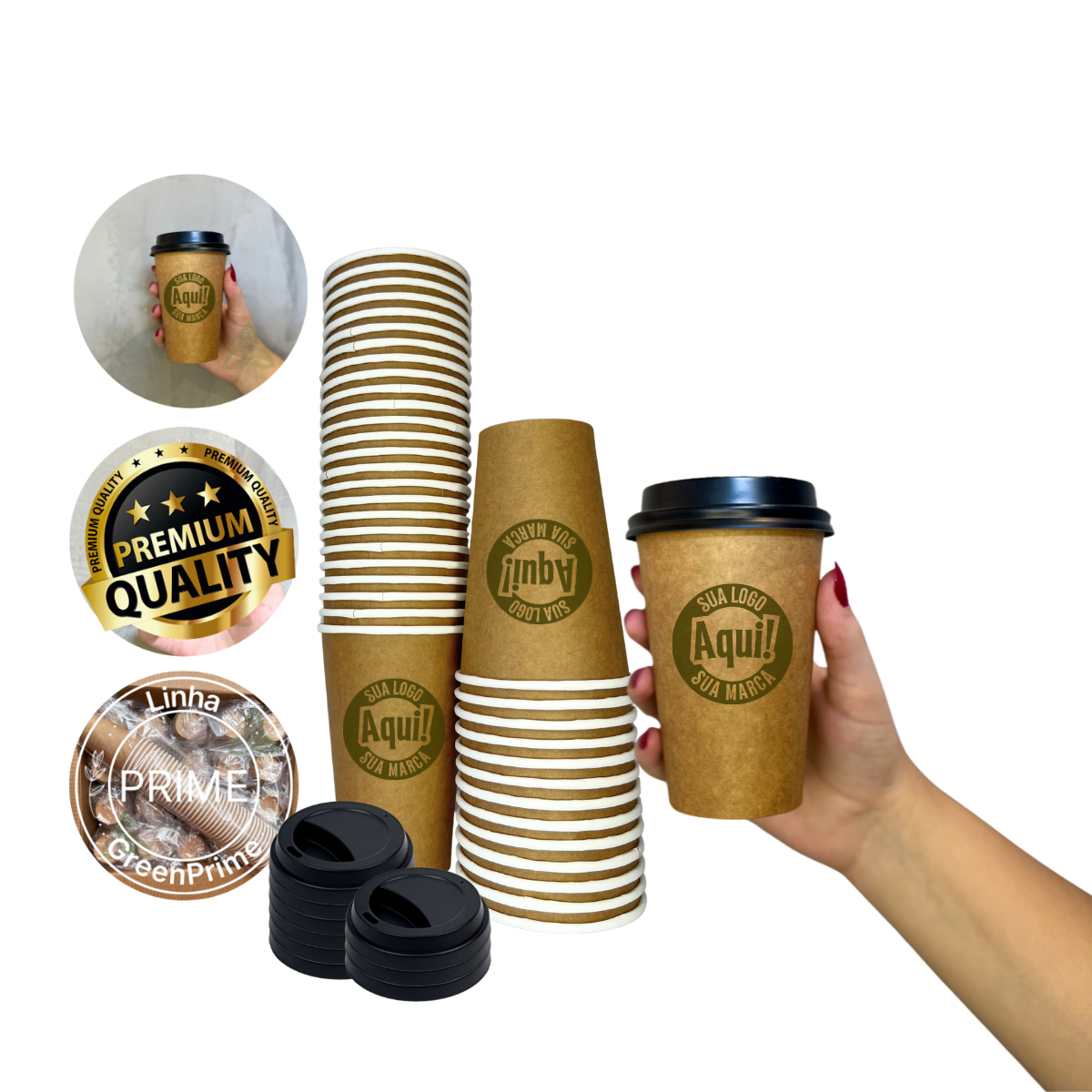 Copo Papel Personalizado Kraft Descartável Bio 300ml C/ Tampa 50un